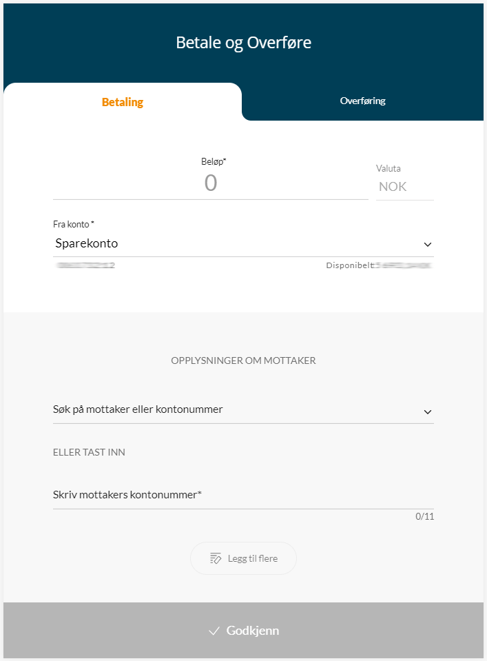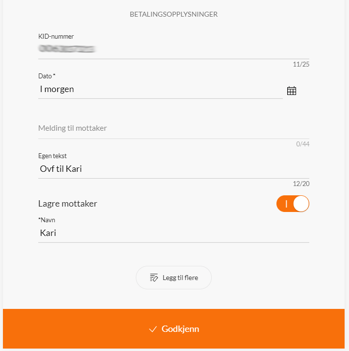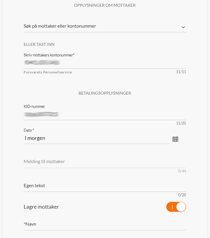 Man kan også opprette mottakere fra betalingsvinduet når man utfører en betaling. Husk å fyll ut navn du går videre for å fullføre betalingen.
