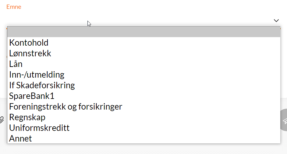 Velg hva meldingen gjelder ved å trykke på Emne og velg ønsket emne, Skriv tittel, tekst og legg til evt. vedlegg hvis det er behov for din sak.