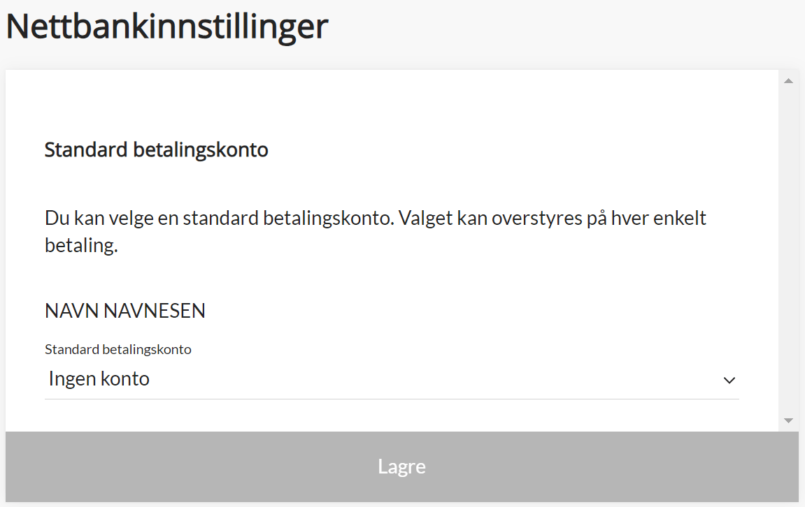 I boksen til Standard betalingskonto, velg konto i listen og trykk på "Lagre".