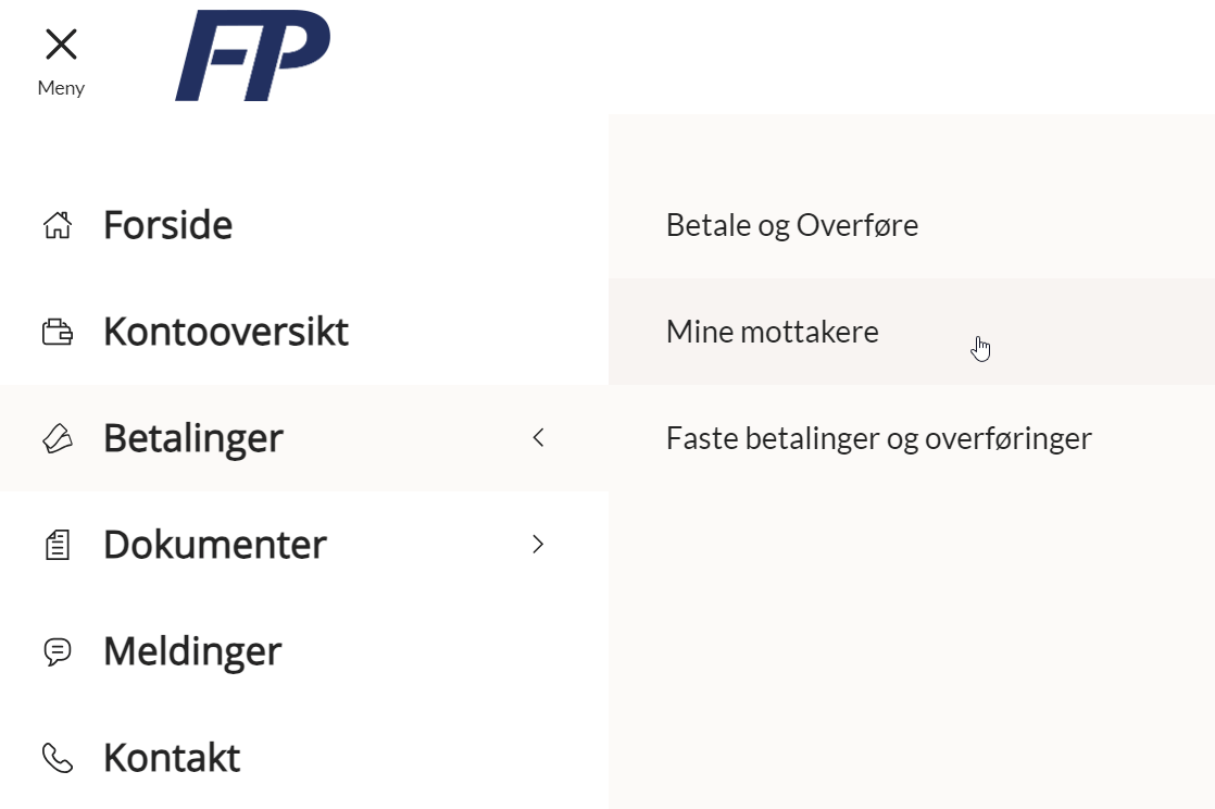 For å opprette eller endre en mottaker trykker du på Meny oppe i venstre hjørne i nettbanken, Betalinger og deretter Mine mottakere.For å opprette så trykker på høyre side av vinduet "+ Legg til mottaker"