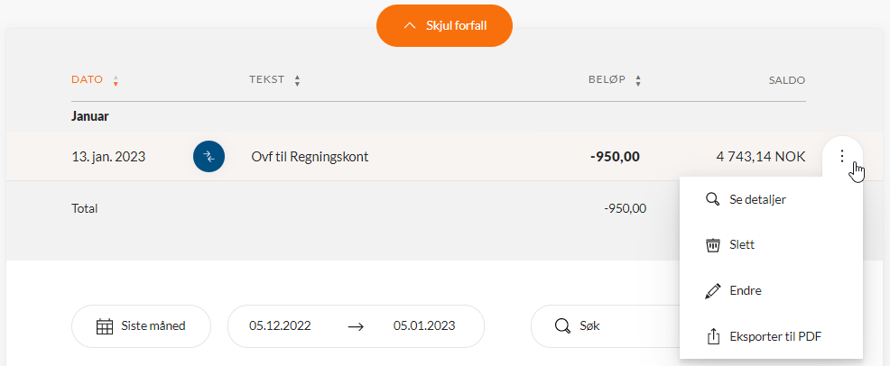 Hvis du har noe til forfall som du ønsker å endre eller slette, trykk på de tre prikkene til høyre på linjen og velg ønsket handling.
