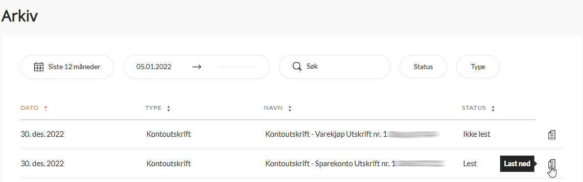 For å lese kontoutskriften så må du laste ned dokumentet. Trykk på papirikonet til høyre på linjen for å laste ned.